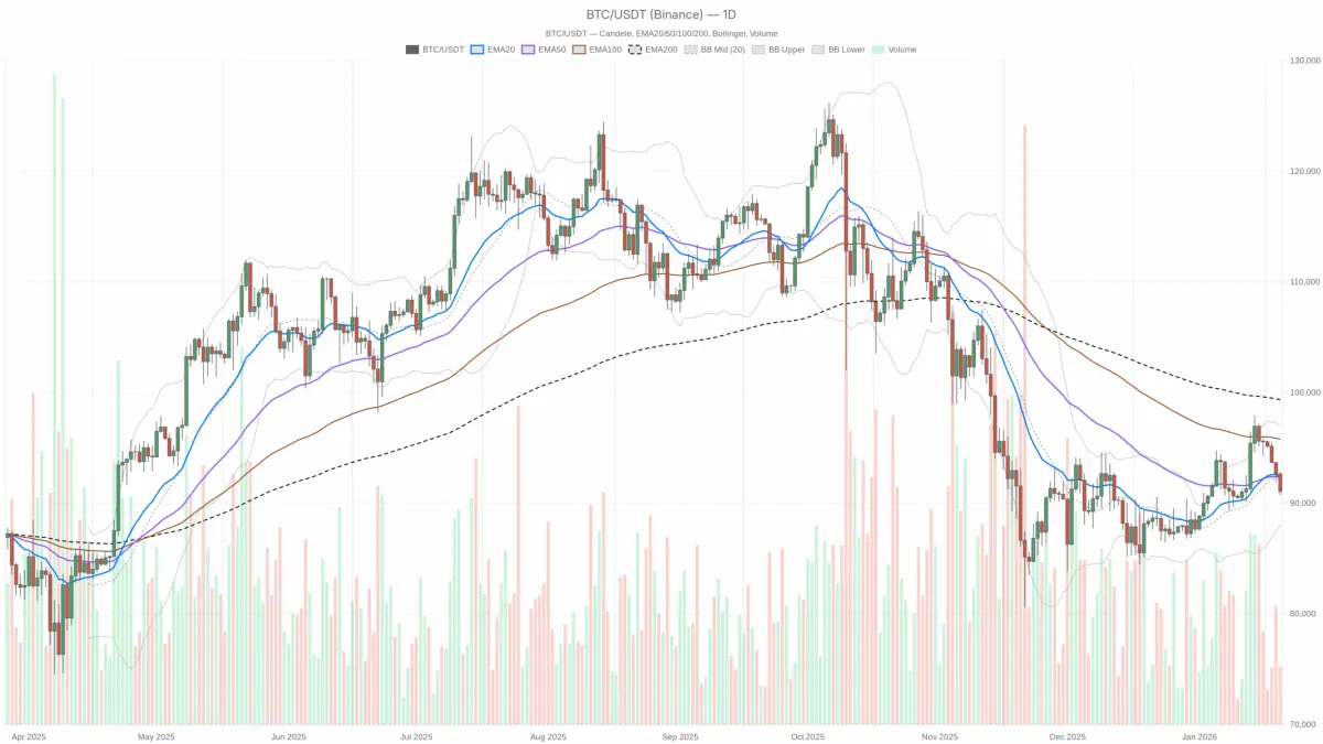 在日线图(D1)上,比特币今日价格在91,054 美元附近波动,略低于91,538 美元的主要日线枢轴点。虽然潜在趋势尚未出现结构性断裂,但与近几日相比,抛售压力正在增加。