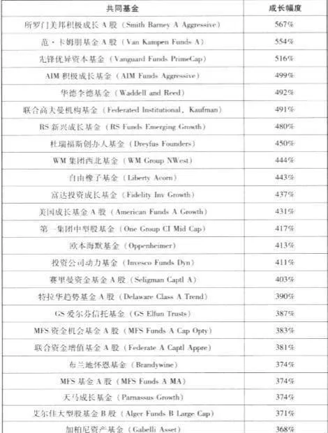 上表所示的有趣资料中,有一个真正的教训可以学习。表中所示是25档绩效最好成长型基金的表现,时间是1990年10月的市场高点到2001年8月中。创造最优秀绩效的基金是所罗门美邦基金(Smith Bar-ney),成长幅度高达567%,第25名的基金成长幅度达到368%,表面看来相当惊人。