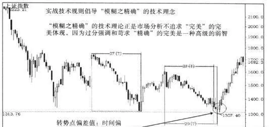 趋势结构理论实战技术规则“模糊之精确”的技术理念要求:在进行趋势结构分析时,并不追求技术规则的高度精确性(即“精确之精确”);在可能发生转势的区域附近,当明确的转势信号发生时,即认为转势成立,并展开相应的交易决策。“模糊之精确”的技术理论正是市场分析不追求“完美”的完美体现,因为过分强调和苛求“精确”的完美是一种高级的弱智。