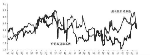 图6-2 美国价值股和成长股的36个月滚动贝塔值