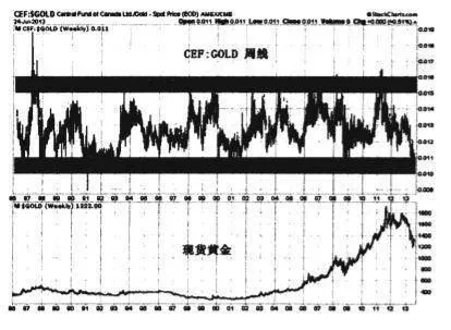 为什么要单独把基金出来做一个判断的维度呢?因为基金经理也是交易员,或者说是有组织、有纪律、有强大的研发操作队伍和优质武器的交易团队。他们属于市场里的正规军,属于“先知先觉”的资金,其余都属于游击队,或者我们称为普通投资者,属于“后知后觉”甚至“不知不觉”的资金。通过观察这些正规军的市场表现,我们即可知道目前的行情是否适合交易。我们现在来比较几个基金的走势,方法很简单,就是用黄金去除以基金,或者基金除以黄金也可以。我们首先看的是加拿大中央基金CEF,它有黄金现货,把它除以黄金,看一下是基金表现好呢,还是黄金跑贏了基金呢?我们看图5-17。