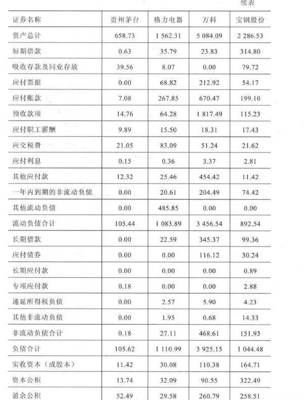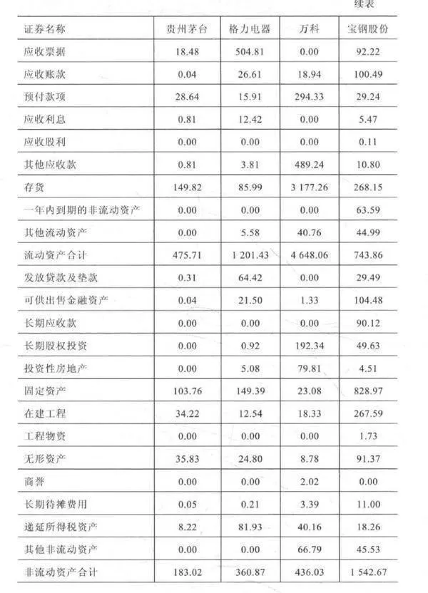 资产负债表最主要的分析方法就是结构分析,结构分析就是总资产作为分母,计算资产负债表中的各个科目占总资产的比重,在分析中要尤其关注比重大的科目,需要在财报及附注中深入了解其详细构成及产生原因。下面以贵州茅台、格力电器、万科、宝钢股份2014年财务报表为例,介绍一些重要的资产负债表科目,如表61所示。上述公司分别是中国消费品、制造业、房地产、工业中的优秀代表。表6-1公司资产负债表