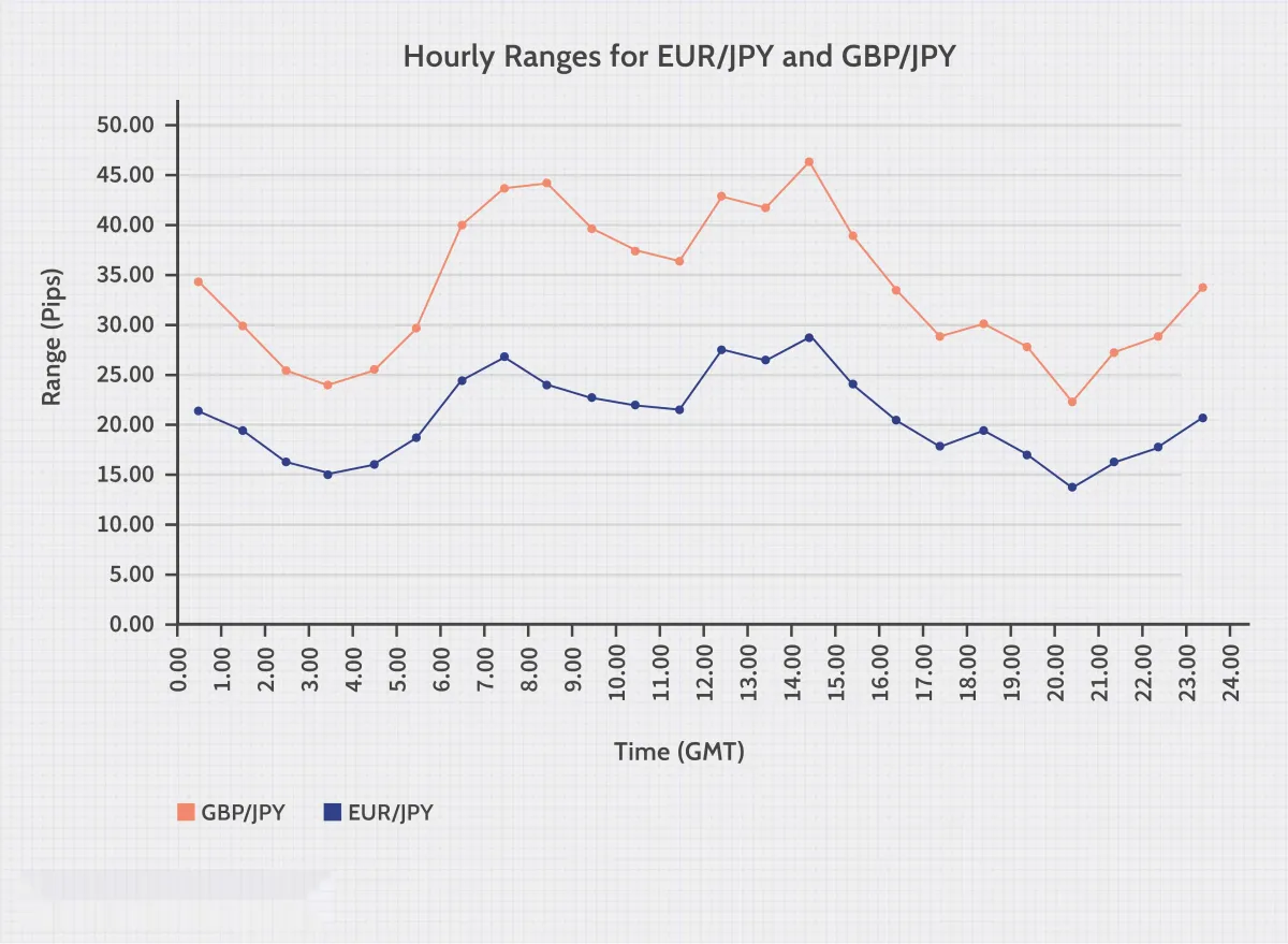 亚洲和欧洲交易时段重叠,由于这些时段交易活动更为活跃,有时会造成更大的波动。下图显示了格林威治标准时间上午 7 点各种货币对的小时波动幅度。