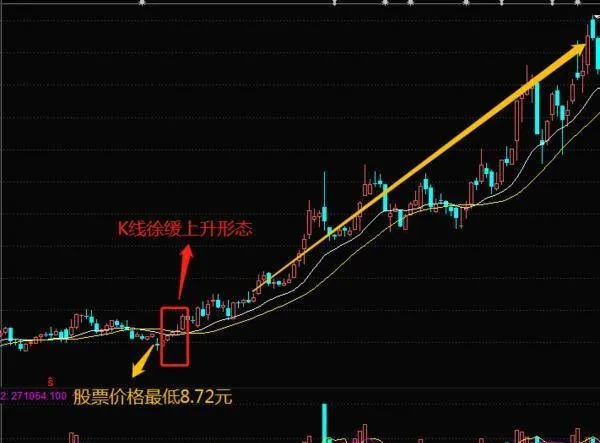 2.K线的徐缓上升的形态全都是被阳线构建成的,说明多头力量占领了很高的优势。这个时候是短线的投资者或者是波段的投资者重要的进入点。