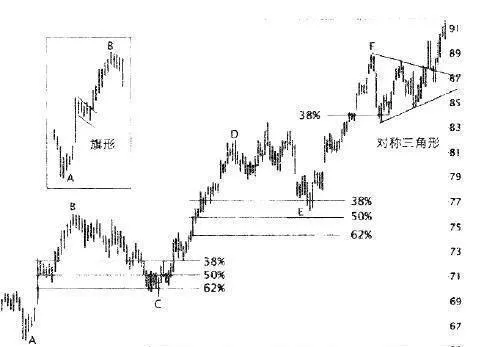 股价从C点上升到D点,在其约50%上开回调处形成支撑,点E。股价从E上升到F,在对称三角形的底部形成了支撑,支撑位在顶点F下的38%回调处。