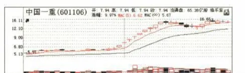 大龙头中国一重(601106)在一个月左右时间,温和上扬了20%左右,每日涨幅很少超过3%,一个月两个涨停板,比起后来主升浪拉升期的气势,这种上涨算是含蓄的了,几乎可以忽略不计。见图。