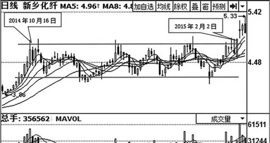 此后,该股一直运行于该水平通道内。投资者可以根据个人实战技术水平,选择参与短期交易。2015年2月2日,该股股价低开高走,收出一根大阳线,且这根大阳线一举突破了新乡化纤股价运行的水平通道。这说明股价短期内将启动一波上涨行情。