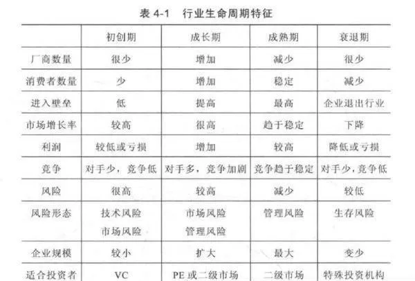 行业初创阶段(幼稚期),由于行业刚刚诞生,进入壁垒低,企业的数量少,市场竞争相对较弱,技术相对不成熟,产品品种单一,质量较低且不稳定。由于大众对其产品尚缺乏全面了解,市场规模狭小,而企业的商业模式不成熟,研发和产品推介的投入大,造成行业利润微薄甚至亏损。属于初创期的行业,未来增长空间想象大,但发展不明晰,承担的风险高,具备高风险、高收益特性,适合风险投资机构投资。