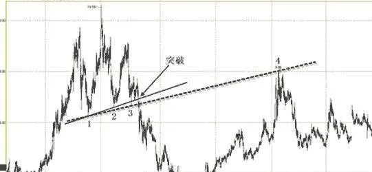 注意图中的虚线,在颈线被突破后用点1和点3做一条切线,头肩顶形态中的所有价格变化全部涵盖在内,来体现最强的支撑和压力。我们发现股价在后期的大辐反弹中,新的支撑线体现出沉重的压力,股价在此见顶回落了。
