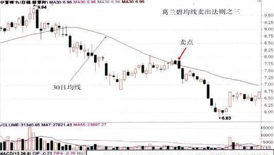 收盘价在平均线下方运动,反弹没有能向上穿越平均线面平均线又趋于下降,这时是较好的卖出时机。