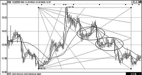 第一,选择大盘指数或者个股的某个转折点作为江恩箱起点,点击左键后按住不放,然后拖动鼠标,即可拉出一个江恩箱。江恩箱起点决定了江恩箱的测市效果,因此投资者最好能多试几个起点,直至江恩箱中的各条角度线能够最大程度地反映股价运行趋势为止。