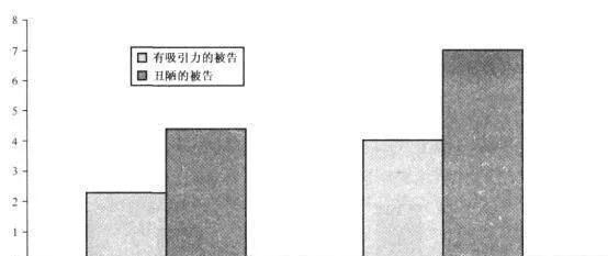 然后,他们要求学生按0-5分的标准对被告人被判有罪的可能性进行评分。外貌有魅力的被告的平均得分为2.3,丑陋被告人的平均得分则是4.4 !这就是说,仅仅是外表就让犯罪概论的可能性相差近两倍!他们还要求对刑期进行估计(最长不超过1个月)。丑被告的平均刑期为7个月,漂亮被告的平均刑期只有4个月(见图10-4)。