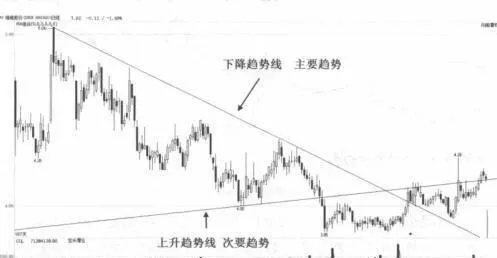 对于下跌中的上涨趋势,其实就是股民通常说的反弹。如图3是维维股份(600300)近两年的K线走势图,在图中可以看出该趋势是一个明显的下降趋势,但是在下降过程中出现了反弹,也就是上涨次要趋势。
