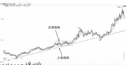 股价运行在上涨趋势线之上,在进行回调时,股价跌到主要趋势线就止跌并再度上涨,此时将主要趋势线上方形成的股价低点进行连接就成为了上涨次要趋势线。对于上涨次要趋势线同样分为上涨、横盘、下跌三类。