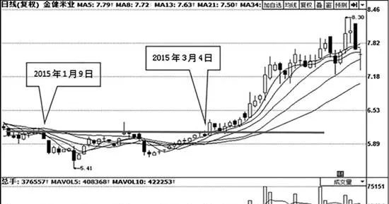 如上图所示,金健米业(600127)。金健米业从2014年12月开始下跌,2015年1月初曾有过一段时间的回调。1月9日,该股以一根中阴线打破了之前的短暂整理态势,开始了下跌行情。