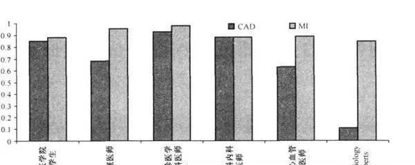 图19-6为各层次专业群体接收急性心肌梗死(心脏病,MI)和冠状动脉疾病(CAD)患者的概率之间的相关性。MI和CAD危险均对医学学生接收患者决策存在重大影响。实际上,这种情况一直持续到心血管医师层次。作为专业级别最高的群体,心血管专家则只关注患有MI的危险。这一结论再次强调了关注重要因素、而不要痴迷于追求信息数量的必要性。