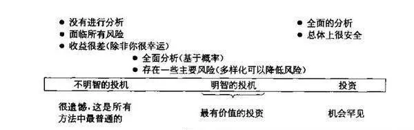 在后来的工作中,他改变了对股票购买者只有投机者和投资者两大阵营的观点。他提出可能存在目的在于争取出色业绩的一种新的第三方分类一但只有在严格的限制条件下才有可能。格雷厄姆后来认为投机因素几乎存在于证券分析师涉及的所有情况。在某些情况下投机因素是相当重要的,分析师的任务只是使这些投机因素处于较小的范围内,但购买者面临着大量盈利和潜在严重损失两种可能性—这些风险必须有人承担。格雷厄姆将投机分为两类,每一类有完全不同的含义。不明智的投机交易与原有定义一致:缺乏适当的知识和技能的购买;承拒比所能亏损的钱更多的风险忽视定量分析;重视投机回报;忽视个人成功投机的能力。