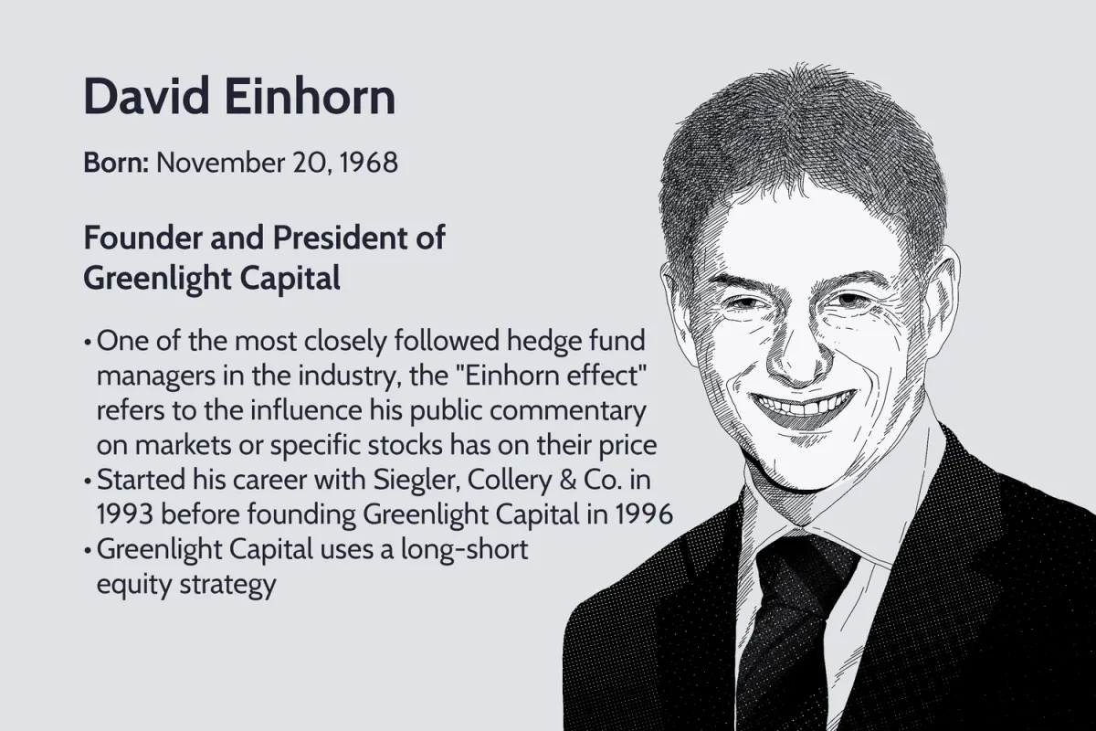 - 大卫·艾因霍恩 (David Einhorn) 是一位成功且受人尊敬的对冲基金经理,他于 1996 年与他人共同创立了 Greenlight Capital,该公司目前管理的资产超过 100 亿美元。
