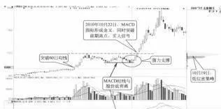 在上例中,2010年10月22日,MACD指标金叉形成的同时,股价同时也向上突破前期高点。这两个看涨信号同时出现,更加强了3浪的可靠性。