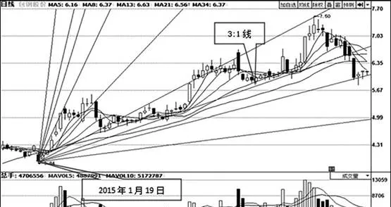 股价上涨一段时间后出现调整时,如果此次调整属于弱势调整,那么股价下跌到3:1线时,就会受到江恩角度线的支撑重新上涨。