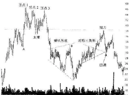 在图的左边部分有三个相近的顶点,用顶点1. 顶点2和顶点3来表示。三个顶点几乎是在相同的价格附近,大约是46美元。一个看不见的天花板横在它们之上,使得价格难以爬升得更高,有此三个顶点的高度为证。当价格下降低于三个顶点之间的最低点时,我们可以确认这是一种有效的图形—三重顶。对于那些持有股票的人来说遇到这种图形就遇到麻烦了,因为股价注定是要下跌的,有时下跌幅度之大如图4.1所示。
