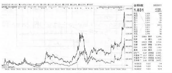 金桥B股(SH: 900911) 是A股上市公司浦东金桥(SH: 600639) 发行的B股,两只股票背后对应的是同一家公司。通过将两只股票收益率叠加,发现1993年5月至2015年7月,金桥B股二十多年的收益率约为13倍,而浦东金桥同期的收益率仅为4倍多,同一家公司,为何股票长期收益率竟然相差了近10倍?奥秘就在于估值,金桥B股长期的估值为浦东金桥的一半甚至不到一半,即同样的股权在B股市场买较A股便宜了至少一半,如果算.上现金股息再投资,便宜的B股收益率会更高,如图2-5所示
