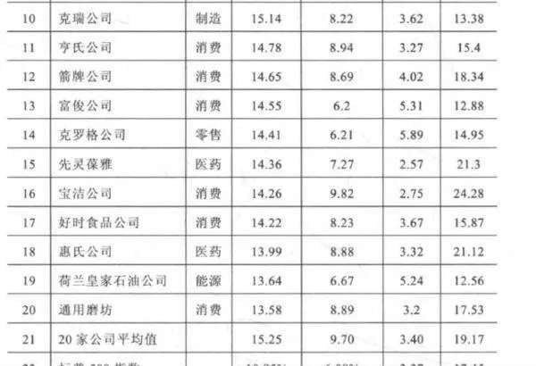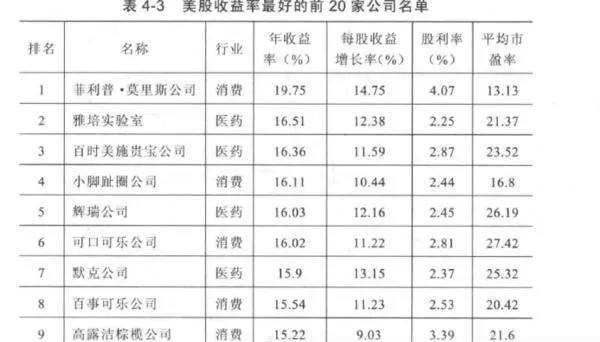 西格尔所著《投资者的未来》一书研究了从1957~2003年46年间标准普尔500家原始公司的股价收益率,其中表现最好的20家公司与标准普尔500指数的整体收益差距极大。 在表现最好的20家公司中,有两个行业牢率占据着统治地位:高知名度的消费品牌公司和著名的大型制药企业。这些公司都获得了广泛的认同和消费者的信赖。它们在过去半个世纪里经历了经济环境和政治气候的巨大变化并最终生存下来。此外,这些公司都积极地开拓了国际市场。表4-3 所示为20家公司收益率情况。