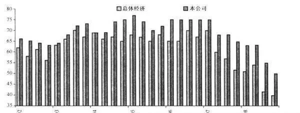 最常见的行为偏差或许就是过度乐观与过度自信。我怀疑绝大多数企业管理者都同时存在这两个问题。我认为,杜克大学对CFO进行的调查,是说明过度自信的最佳例证。每个季度,杜克大学对CFO看待未来经济形势的乐观程度进行调查(以0到100评分,0=极度悲观,100=极度乐观)。同时,他们还要对本公司经济形势的乐观程度发表意见。