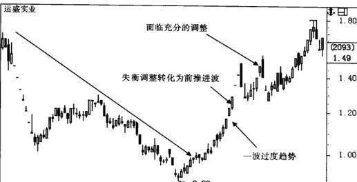 原推进趋势反转只是事后的定义,在此之前应定义为一波调整失衡,即推进趋势末端的大辐失衡调整,从而将失衡调整波段转化为反向的推进波段。值得注意的是,一波过度趋势必然面临同级别的充分调招,调整结束后将延续后推进波(图1-3-15)。