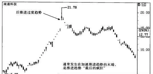 后推进过度趋势是推进趋势加速状态的表现,通常发生在加速推进趋势的末端,是推进趋势“最后的疯狂”。后推进过度趋势是反转的预先信号。一旦反转,其反向推进的力度较大(图1-3-16)。