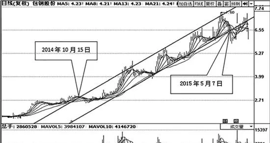 如上图所示,包钢股份(600010)。包钢股份的股价自2014年10月15日开始进入震荡上升周期。在上涨过程中,该股股价始终处于上升通道线区域内。股价快速上涨时,遇通道线上轨后回调;股价回调时,遇通道线下轨反弹向上,直至2015年5月7日股价跌破通道线。