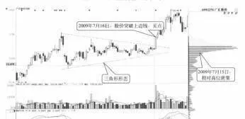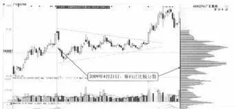从2009年4月下旬到7月中旬,广汇股份(600256)冲高回落,以三角形形态不断震荡。从4月21日和7月15日的筹码分布图如图3、图4所示可以看出,该股的筹码在震荡中逐渐由分散到集中,形成相对高位密集峰,表明市场正在不断蓄势。