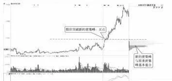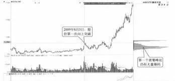 如图3所示,2009年8月5日,新农开发(600359)股价第一次向上突破前期低位密集峰时,虽然有部分筹码上移导致上方也形成一个密集峰,但第一个密集峰处仍然存在大量的筹码。