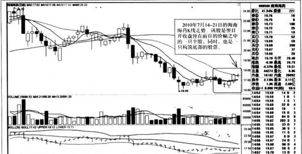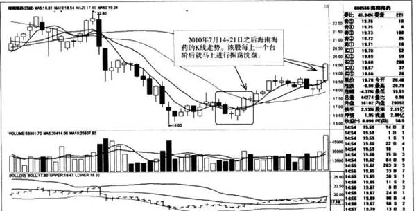 上图为2010年7月14 -21日之后海南海药的K线走势。该股每上一个台阶后就马上进行振荡洗盘,这也是构筑底部的另一个特征,振荡洗盘完毕后就立即放量拉升。