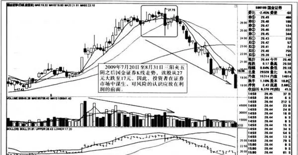 上图为2009年7月20日至8月31日三阳夹五阴的之后国金证券K线走势,该股从27元大跌到17元,因此,投资者在证券市场中谋生,对风险认识应放在首位。