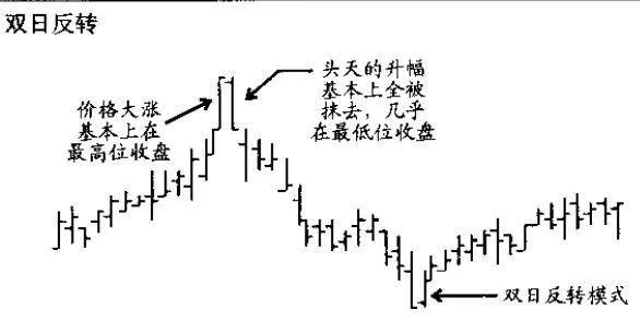 双日反转(示意图 6-7)也是在短时间内发生的逆转现象。它总是出现在一次重要上升浪之后。在该模式出现的第一天,价格攀升到可观的新高度,并在最高位或接近最高位收盘。第二天,开盘价大体处于同一水平,但收盘价把昨日的升幅全都抹去。第二天的收盘价跌到头天的开盘价附近,甚至比头天的开盘价还低。如果这两天的成交量非常大,那么,它有助于我们判断这是不是双日反转。从交易者的心理状态看,他们都期盼强劲的上行趋势第二天仍会延续。但是价格不升反降,交易者的信心大大受挫。