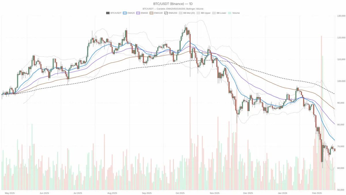 - 重新站穩日線樞軸點(>68.3萬美元)上方,然後將72000美元的布林帶中段/20日均線區域從阻力位轉爲支撐位。日線收盤價高於約72000美元將是市場力量從純粹的趨勢跟蹤拋售壓力轉向均值迴歸買盤主導市場的第一個重要信號。