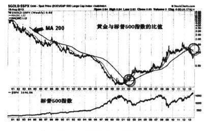 轉折點發生在2002年,盤面上的均線出現所謂的“金叉”,隨後均線呈多頭排列。我們用的是周線圖,因爲周線盤面上的信號相對日線比較平滑。這種情況下,你就應該去買黃金,而不要去買美國的股票。美國股市從2001年到2012年確實呈現較大的區間振盪格局,並沒有太好的單邊交易機會,所以這個時候做黃金可能比較靠譜一點。我們現在講的都是黃金的電子盤,在黃金的電子盤上進行有槓桿的雙向交易是爲了賺取價差而非保值。