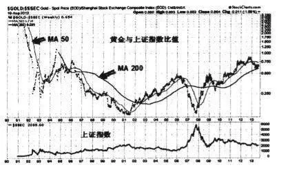 但是2013年這個盤面有一點改變,這兩條均線“死叉”了。這個時候你要去投資美國股市呢,還是投資黃金?近期來看,如果你對股市不太瞭解,那麼就算你不去做多股票,也不應該去做多黃金。這裏講的是美國的股市,如果買中國股票會怎麼樣呢?如果我們選擇中國股市的上證指數,代碼是SSEC,當然讀者還可以用行情軟件選擇深圳成指、中小板和創業板指數,我們下圖(圖5-14)就用上證指數爲例。如果在黃金和中國股市中選擇,我們現在是該買黃金呢,還是該買上證的股票?如果兩者的比值下跌表示你應該買股事,而上漲則表示應該買黃金,原理和剛纔講的標普500指數一樣。
