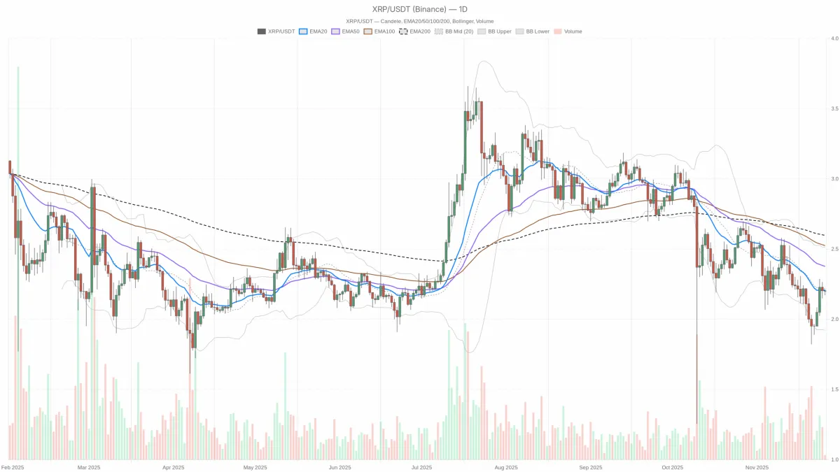 在日線圖上,價格接近 2.2,略低於 20 日均線(約 2.21),更明顯低於 50 日均線(約 2.38)和 200 日均線(約 2.6)。這種移動平均線的排列使主要走勢仍呈看跌態勢,在價格能夠有力地重新站上 20 日均線和 50 日均線之前,任何反彈都可能被視爲賣出機會。
