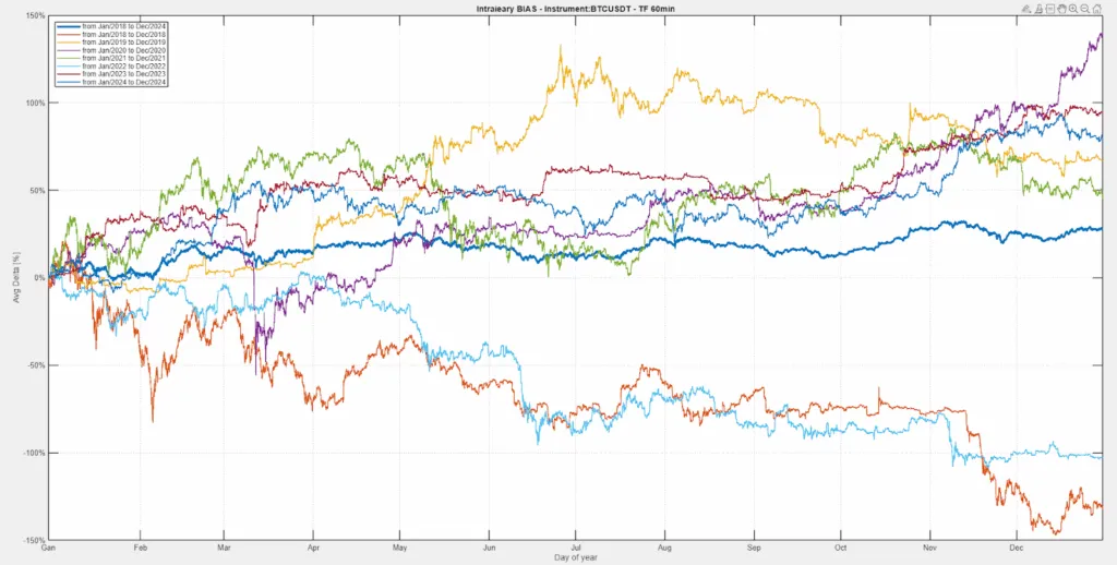 從系統交易者的角度來看,依賴統計數據和分析,可以考慮以比特幣(BTC)的價格作爲參考,分析其月度季節性,尤其是在下半年。下圖顯示了 2017 年至 2024 年 BTC 的平均趨勢(使用 Unger Academy® 的專有軟件 Bias Finder ™計算得出)。