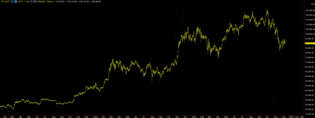 隨着我們進入 2025 年的最後階段,比特幣目前在遠低於其高點的水平下波動,大約在 90,000 美元至 93,000 美元之間,比 10 月份的峯值低了約 25% 至 27%。宏觀經濟環境的特點是美聯儲降息,但整個加密貨幣行業的情緒仍然明顯謹慎。