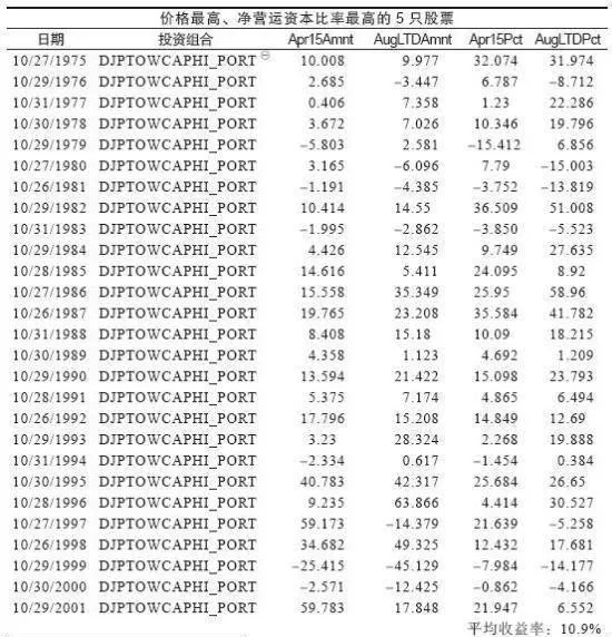 注:道瓊斯工業指數價格最高、淨營運資本比率最高的5只股票投資組合。