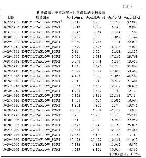 我們可以將上述指標與股價比較,作爲篩選股票的標準。表11-6說明了買進道瓊斯指數中5只價格最高、淨營運資本比率最高的股票的結果。表11-6的續表是關於5只價格最低、淨營運資本比率最低的股票的結果。兩種方法的結果差別較大,你從這些指標中就能看到。低價股的表現要好於高價股,其中有一定道理。撿便宜的投機商喜歡低價股,30美元的股票上漲3美元到10%的增幅比200美元的股票上漲20美元到10%要容易得多。