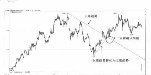 如圖1是華勝天成(600410)2014年10月至2015年1月的走勢圖,在圖中可以看到主要趨勢是下跌趨勢,但是次要趨勢是上漲的,此時主要與次要趨勢線形成一個關鍵的三角形,當股價上漲到該三角形頂部時突然下跌。那麼此時就證明了該次要趨勢還不能對主要趨勢進行扭轉,只能算是盤中反彈。對於三角形的含義將在後面的章節講解。