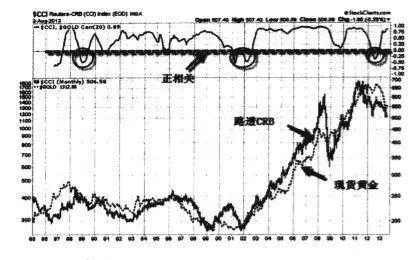 上面的附圖是這兩個品種的相關性,相關性其實是一個很簡單的指標,英文是:correlation,零軸以上爲正相關,零軸以下爲負相關。從上圖來看,兩者的相關性總體而言都是正相關,零軸以上比較多,而且經常跑到80%或者90%甚至更高的位置,正數越大就越表明正相關度越高,所以CRB指數和黃金正相關的關係還不錯。反而當我們發現兩者的關係轉爲負相關的時候要高度關注,因爲這個時候往往就是比較好的交易機會。