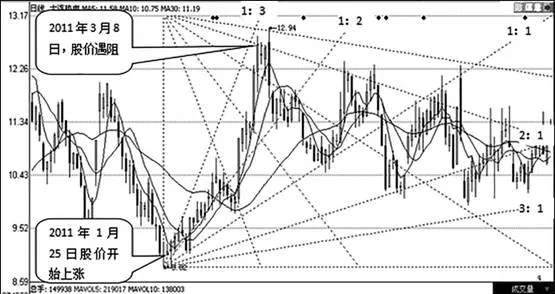 2011年3月9日,股價跌破1:2線後開始一路下跌,隨後在1:1線再次受到支撐。但在支撐一段時間後,股價迅速跌破1:1線,在下跌到2:1線時受到支撐。