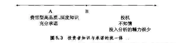 我猜想,一方面,關於投資組合中的每家公司均存在一種純理論的費雪型高質量深度知識的連續統一體;另一方面,投資者在信息不充分、不願深入分析的情況下,投機性地不斷變換購買本身想法錯誤的股票。關鍵的問題是他們是否願意付出費雪方法所要求努力的四分之三。在我看來,付出一半的努力不可能確保做得比市場平均更好(圖5.3中的B點),但肯定取得遠遠優於圖右邊投資者的業績。擁有足夠的決心、經驗和知識(和這些品質的重點),必定能夠戰勝市場,也許不像完美費雪型投資者所取得的業績那樣令人印象深刻,但足以使努力獲得良好回報(A點)。