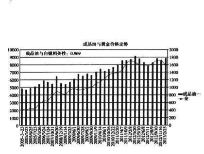 這是我們做的兩幅圖,從2005年到現在,國內成品油價格和金、銀價的擬合。我們發現國內成品油價格和白銀的相關性是94.9%,而與黃金的相關性是96.9%。我們從圖中可以看到當國內成品油價上漲,金銀價也在上漲。而成品油價格下調的時候,金銀價格隨後也是下跌的。不過這個圖標只統計到2013年3月,新規則出臺後還需要經過一段時間的觀察,看看兩者之間是否依然存在着高度的正相關?但從歷史數據來看,當發改委上調國內成品油價格的時候,那麼金銀價可能往上走的概率會大一點,而往下調,金價下跌的概率會大一點。這個聯接很有意思,也許是一種偶然現象,但是它所反映的其實是原油三地變化率的一種均價,一種平滑了以後的均價,它和貴金屬是同向的關係。對於國內成品油的價格大家可以隨時保持關注,都不用去看盤面走勢,平時只要多關注廣播、電視等媒體對於調油價的報道就可以了。如果你發現國內成品油價格再次調整的話,你看這個金、銀價格怎麼走?