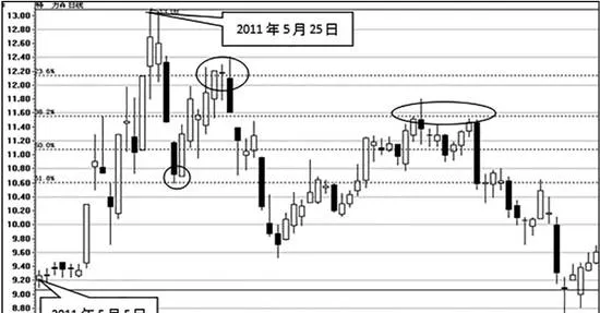 如上圖所示,特力A(000025)。2011年5月初,特力A的股價在9元附近觸底反彈。到了2011年5月25日,該股在13元附近創出新高之後出現回落。投資者要想預測下跌之後的支撐位和阻力位,就可以將這段漲幅作爲基數進行黃金分割。
